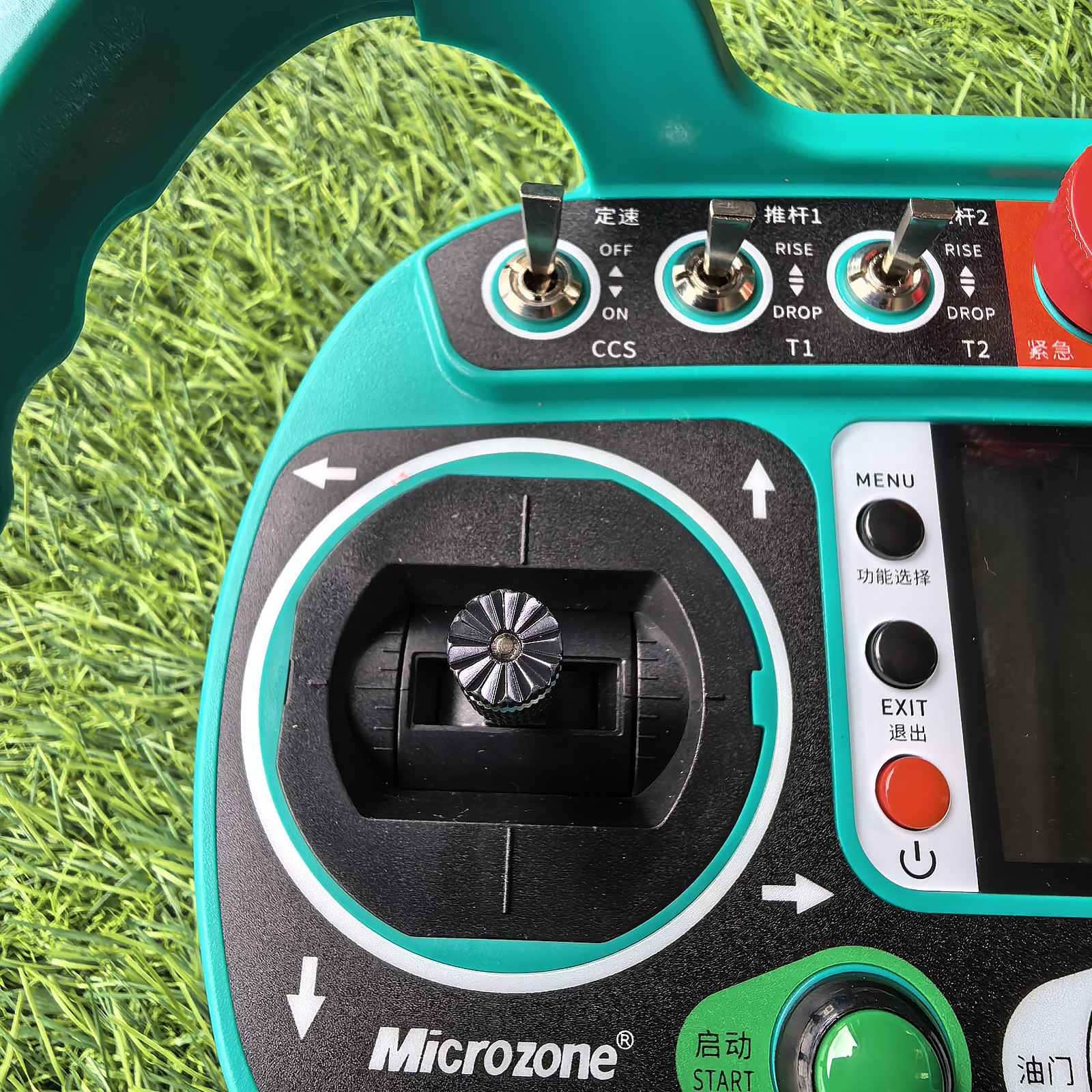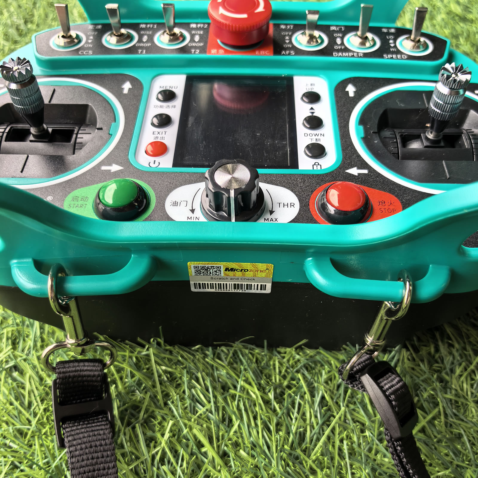 Emergency stop button allows one-touch shutdown of both the remote and the machine in critical situations.